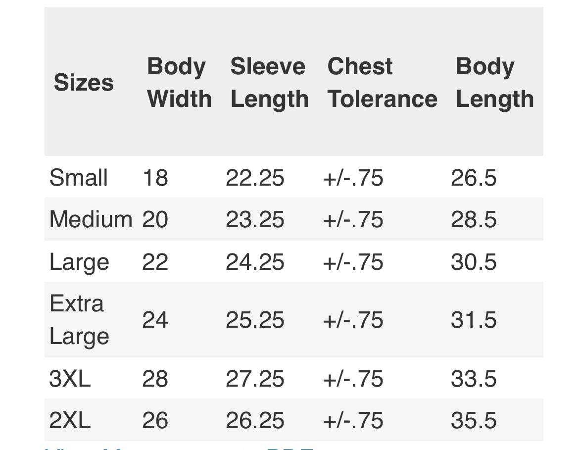 | Sizes | Body Width | Sleeve Length | Chest Tolerance | Body Length | Body Length Tolerance | Chest Width (laid Flat) | Body Width Tolerance | Sleeve Tolerance |